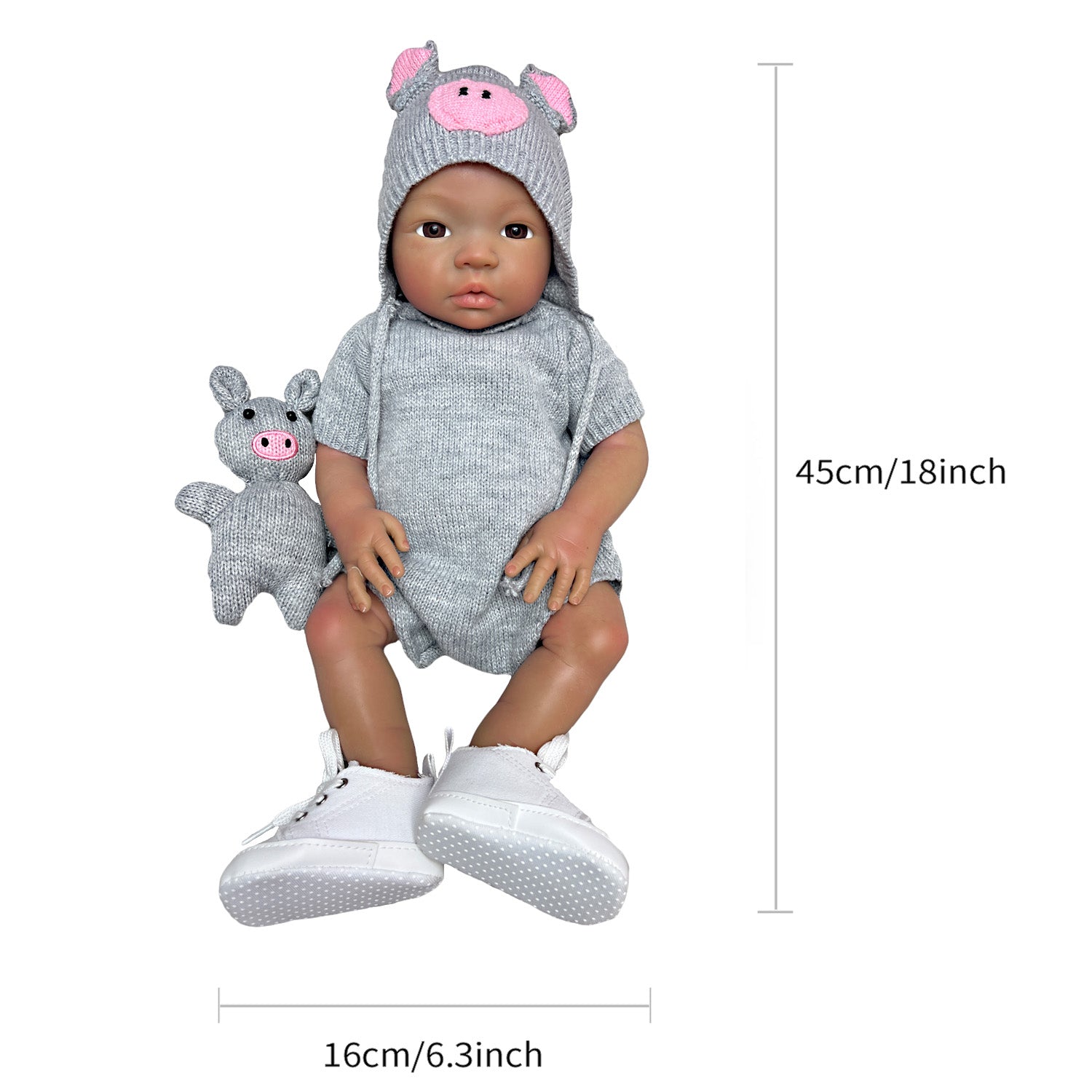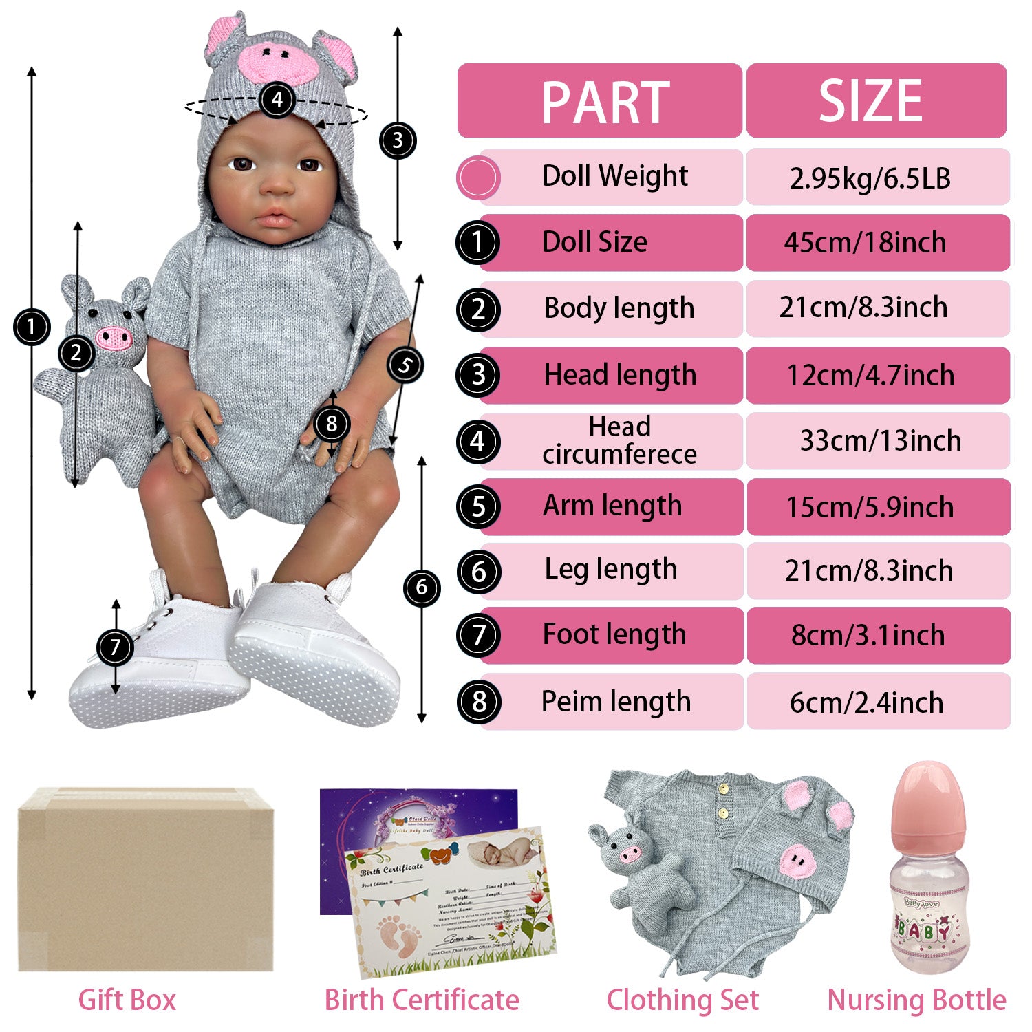Baby size: Around 18Inches,45cm. Due to different measurement methods, allowable error1-3cm. Weight:Doll Net weight is around 2.9KG. Dress:The clothes will be the same as the picture showing. You can change it for the doll by yourself. Structure:It's a Cute Girl!Whole Body are made of Soft Solid Silicone material ,Its's a weighty Doll.Can put into the water and take a shower.It's super soft and can be stretched.High Quality Dolls!!! Full Limbs Can be Turn it Freely.