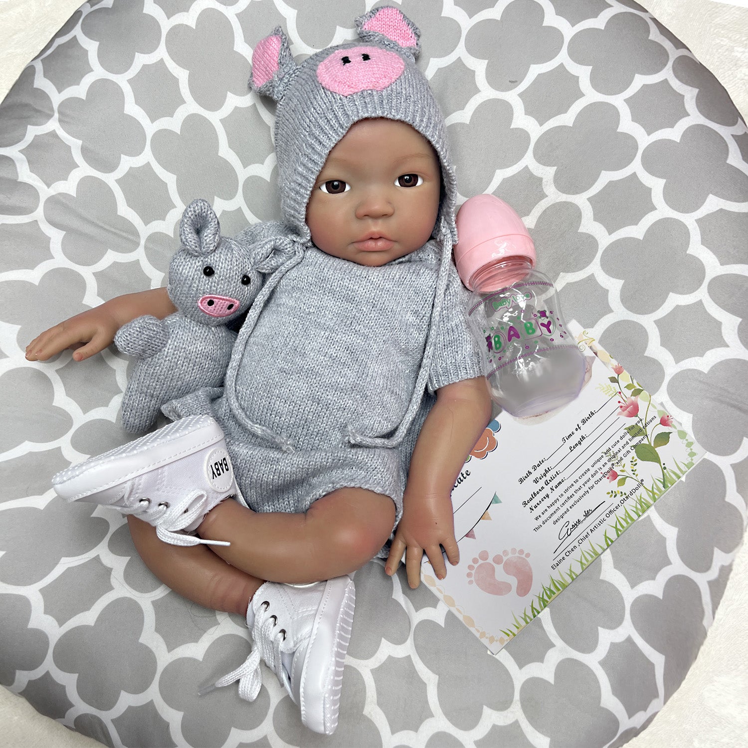 Open Eyes with Paint Eyebrow. Application:Children's Birthday Gifts, Children's Toys, and Etc. Package include:Doll with 1 set of clothes+Toy+Shoes+ 1feeding bottle +certificate.