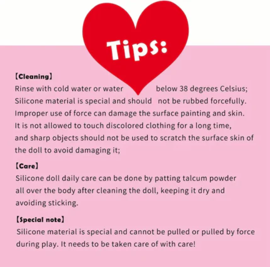 Rinse with cold water or water below 38 degrees Celsius; Silicone material is special and should not be rubbed forcefully. improper use of force can damage the surface painting and skin. It is not allowed to touch discolored clothing for a long time, and sharp objects should not be used to scratch the surface skin of the doll to avoid damaging it.
