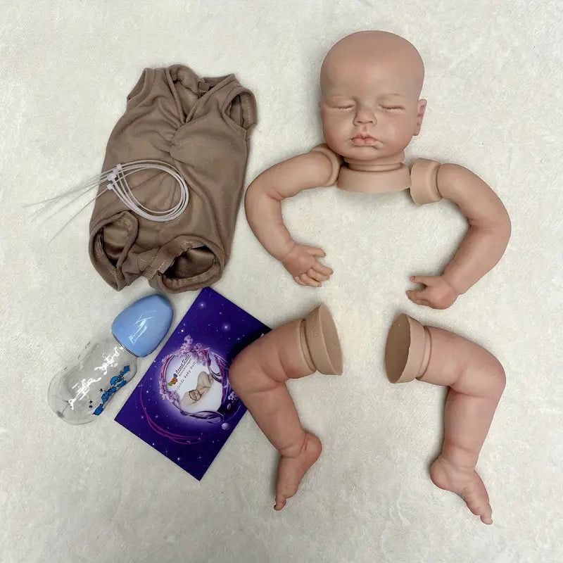 Reborn Kit Size: 20 Inch Weight: Around 1.7kg Eyes: closed eyes Applicable Ages: such as collectors, beginners, adults, parents, girls, boys, the elderly Tips The reborn doll kit comes with a cloth body, no filler, you need to prepare your own filler to fill. The size of this silicone baby kit after reborns is about 20 inches, the exact size depends on each reborn creation. Package Includes 1 x platinum silicone reborn doll kit (head, full arms & full legs) 1 x cloth body with zip ties1 x Blue feeding bottle 1 x Birth Certificate ●The reborn silicone baby doll cannot take magnetic toy pacifier. ●The reborn silicone baby doll doesn't come with any outfits & blankets, waiting for you to dress up! ●Please do not pull hard the doll's fingers, toes and other slender parts to avoid tearing. ●Please do not touch the doll with sharp objects to avoid scratching the doll. ●Please do not let the doll wear dark clothing or touch items containing latex.