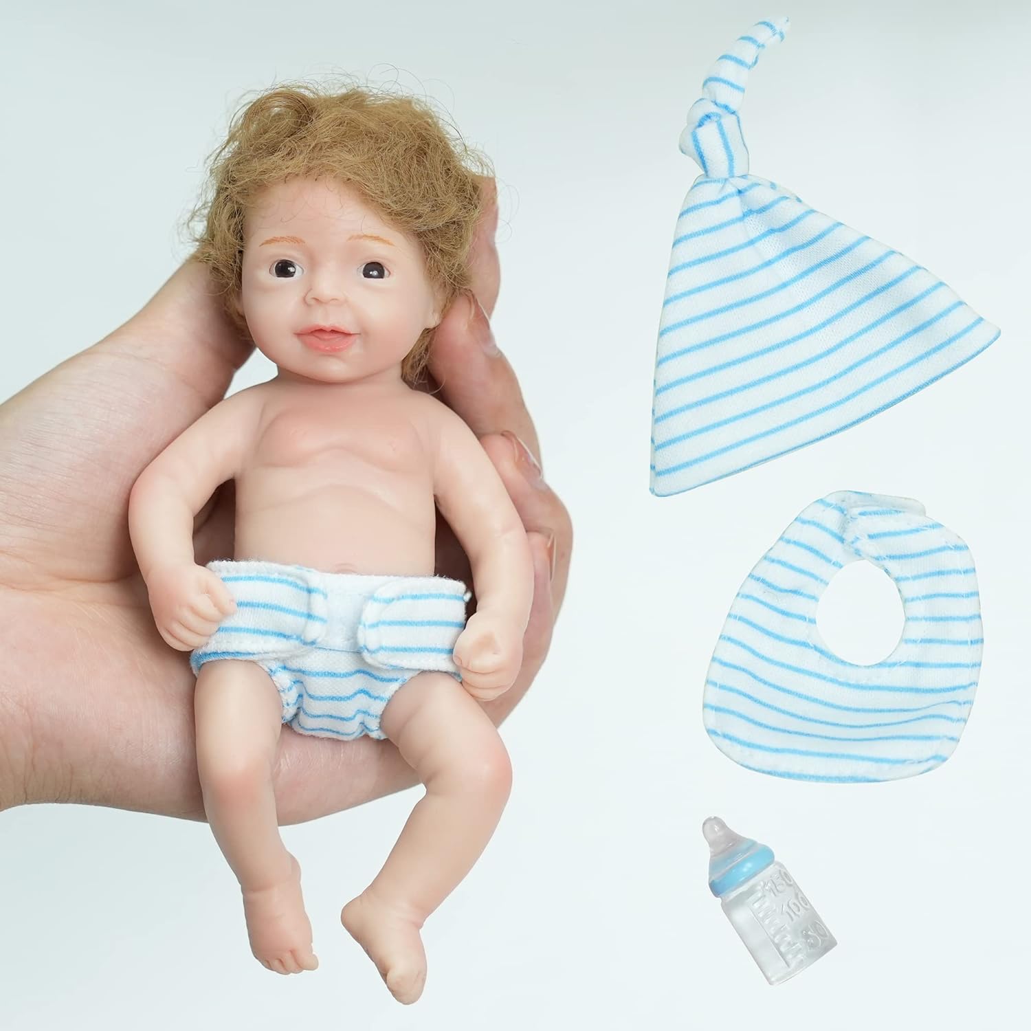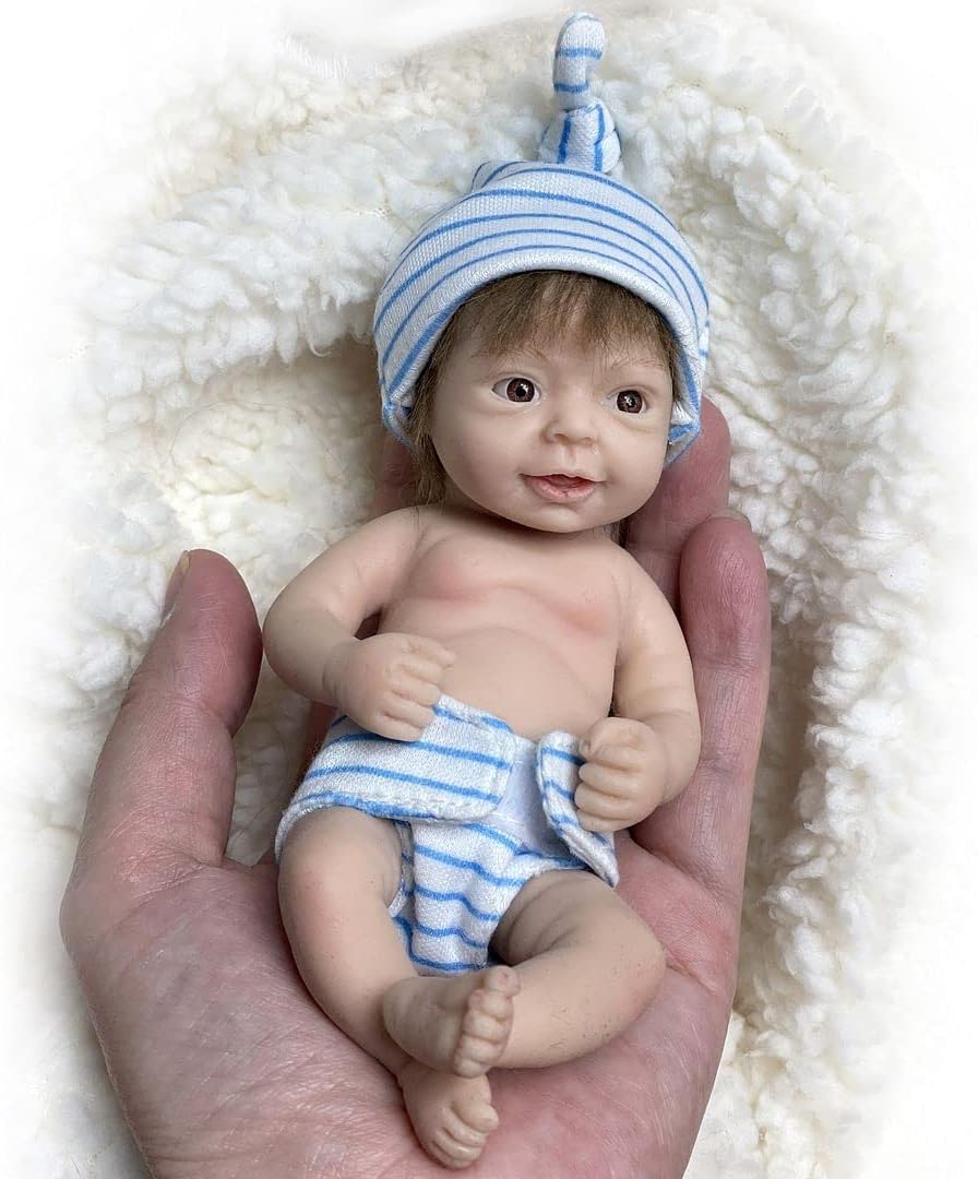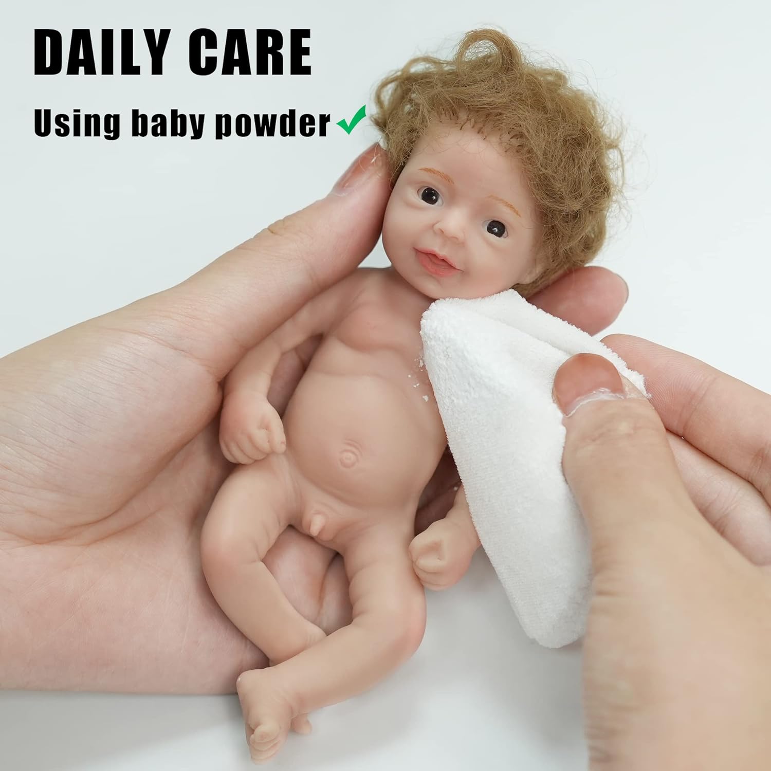 • FEATURES: This is a mini reborn baby doll, anatomically correct boy. Size: 5 - 6 inch from head to toe, weighs 4 OZs, palm-sized, mini and portable; Eyes: acrylic eyes, can't blink; Hair: hand-rooted curly hair; Washable, easy to care and maintain.